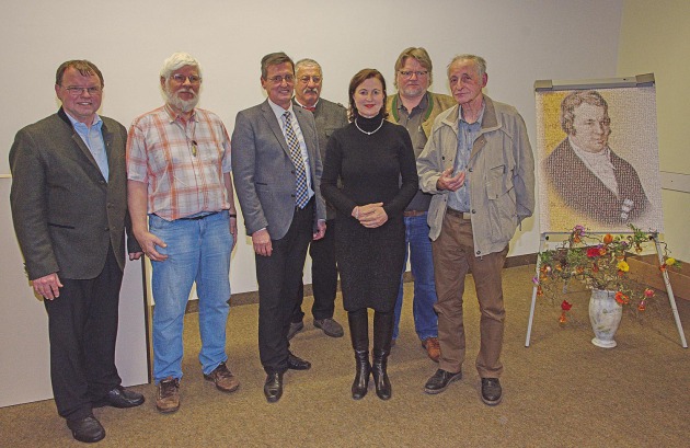 Im Bild die "Hauptakteure" beim Vortragsabend zum 262. Geburtstag von Mathias von Flurl am 8. Februar 2018: v.l.n.r. Dr. Gerhard Lehrberger, Referent Dr. Rupert Hochleitner, OStD Werner Kiese, Josef Brem, Dr. Cornelia Stoffel, Prof. Dr. Günter Moosbauer und Flurlit-Entdecker Erich Keck